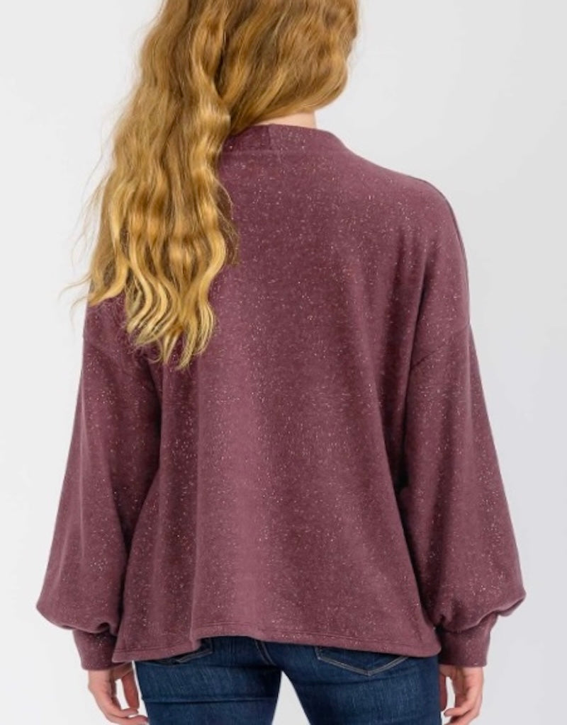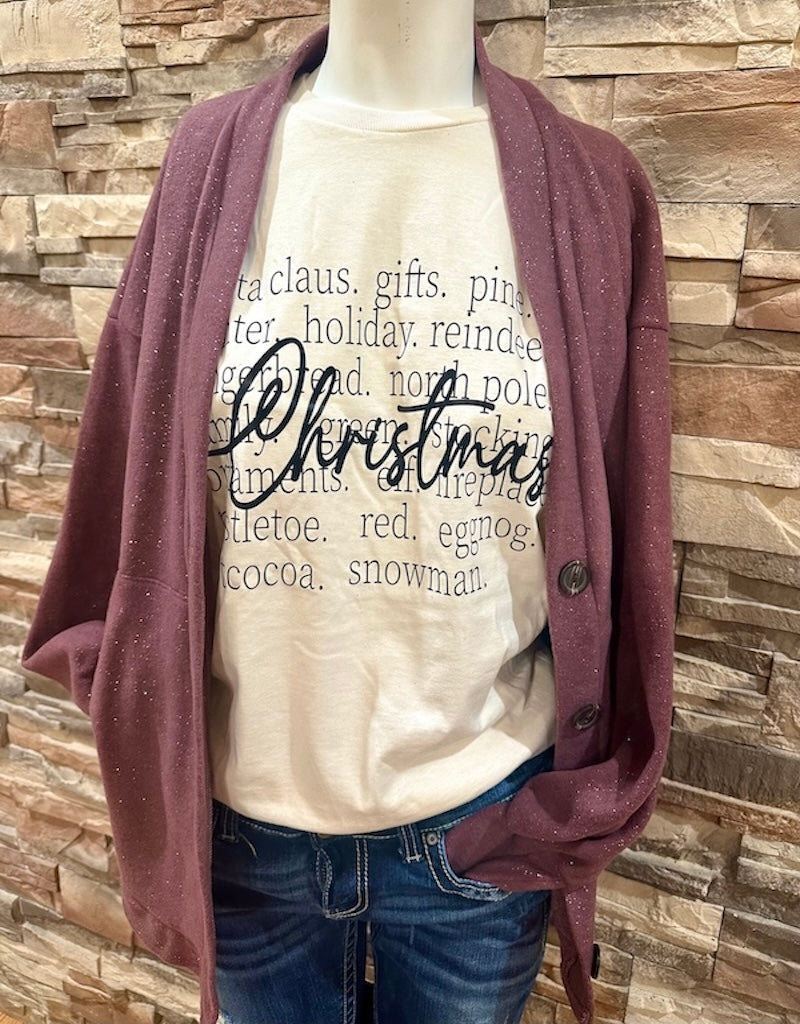 It will be easy to "Keep Your Sparkle" in this beautiful cardigan! The Mulberry color is so pretty and we love the gold sparkles sprinkled throughout the entire cardigan. We also adore the soft material and pockets. The sparkle adds the perfect amount of dress up. It will layer gorgeously over so many of the graphic tees available in The Peekzee Shop. This cardigan is a relaxed fit.