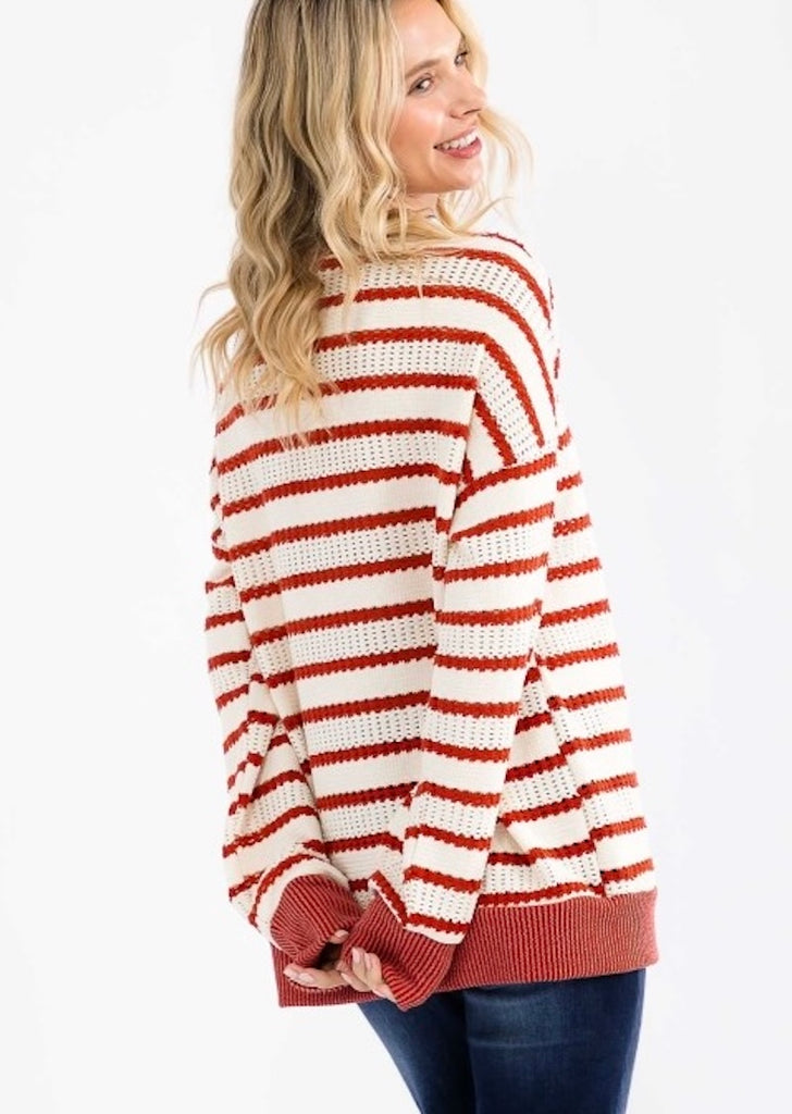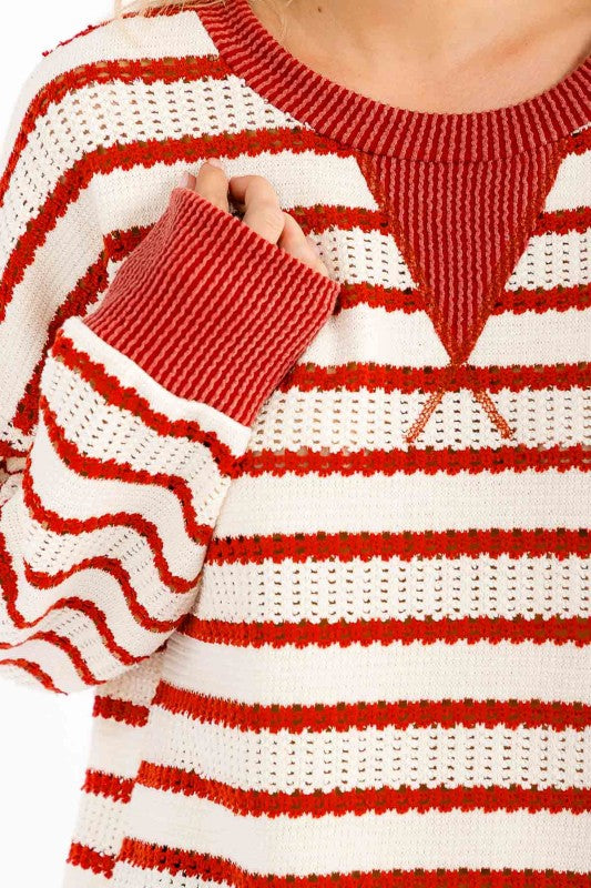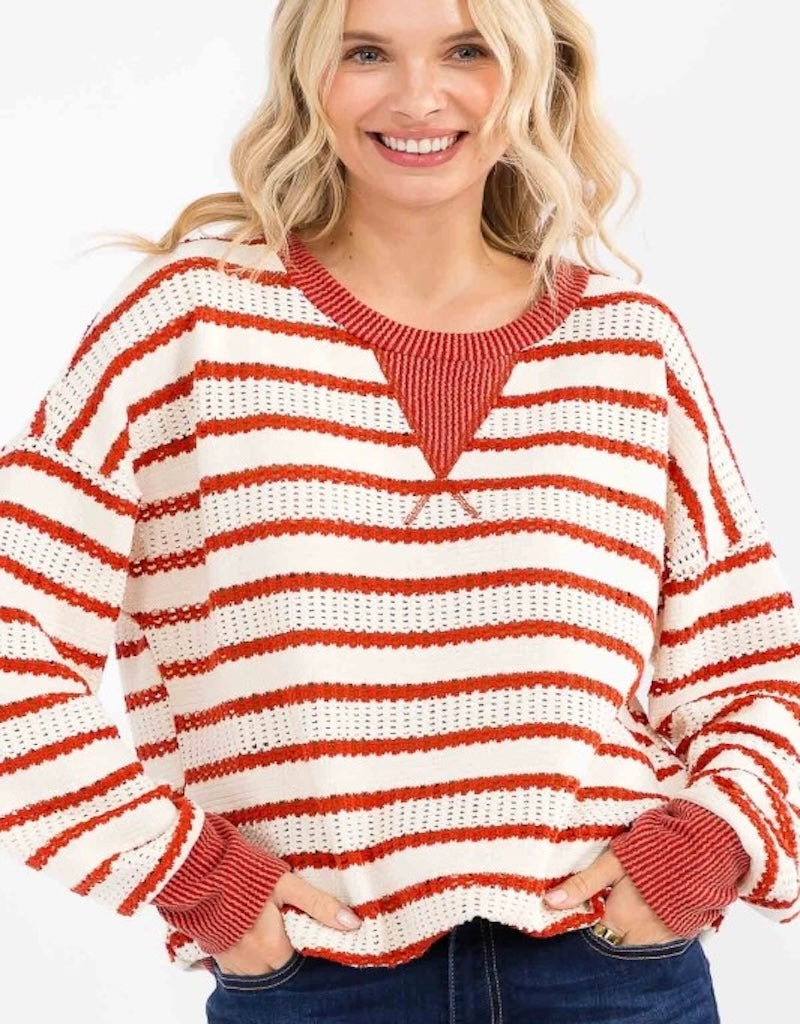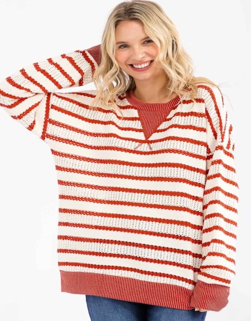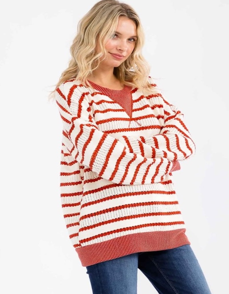 You'll be able to handle "Anything Thrown Your Way" when you're wearing a top this cute! We love the texture, mixed media, and tiny open knits. We also adore the beautiful Rust and Cream color combination. The perfect addition to your wardrobe. This top is a relaxed fit.