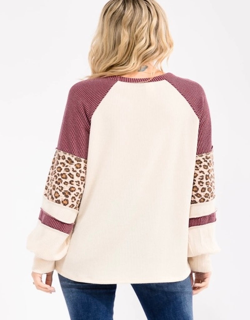 This top will definitely be "Something To You"! We love the Burgundy color block with leopard contrast on the sleeves and neck. We also adore the easy, ribbed material. This top is a relaxed fit.